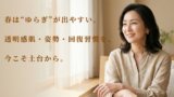 - 変化:姿勢が上がる=呼吸が深くなる→循環UP→肌と体の回復力UP。歩き姿・後ろ姿まで若々しく。
